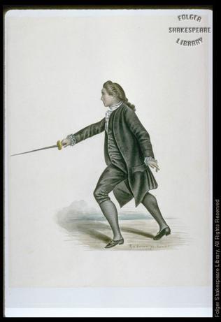 right arm extended, holding sword almost horizontally. He wears contemporary eighteenth-century