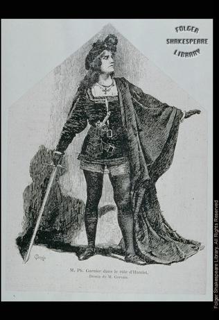 Portrait of Ph. Garnier as Hamlet. Full length, forward, facing right, eyes raised.
