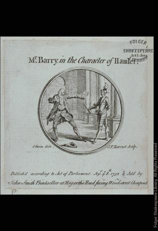 Spranger Barry (1742-1777) as Hamlet at left, full length, standing, forward,