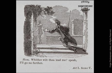 The Ghost at left on the the platform at Elsinore beckons Hamlet, who holds a