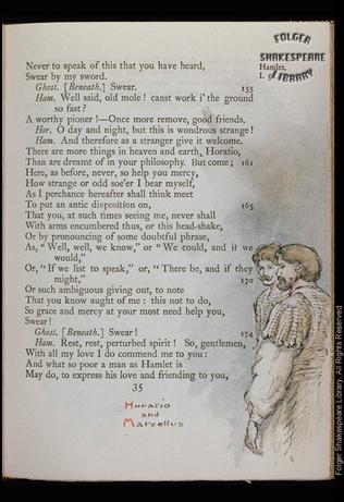 Horatio and Marcellus in right margin, facing left, bare-headed. They appear to