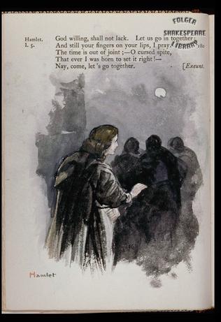 In background, the departing figures of Horatio, Marcellus and Bernardo. In left