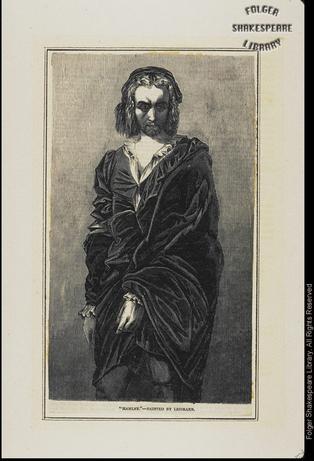 Christ-like, near full length Hamlet with auburn hair, a long black cloak wrapped